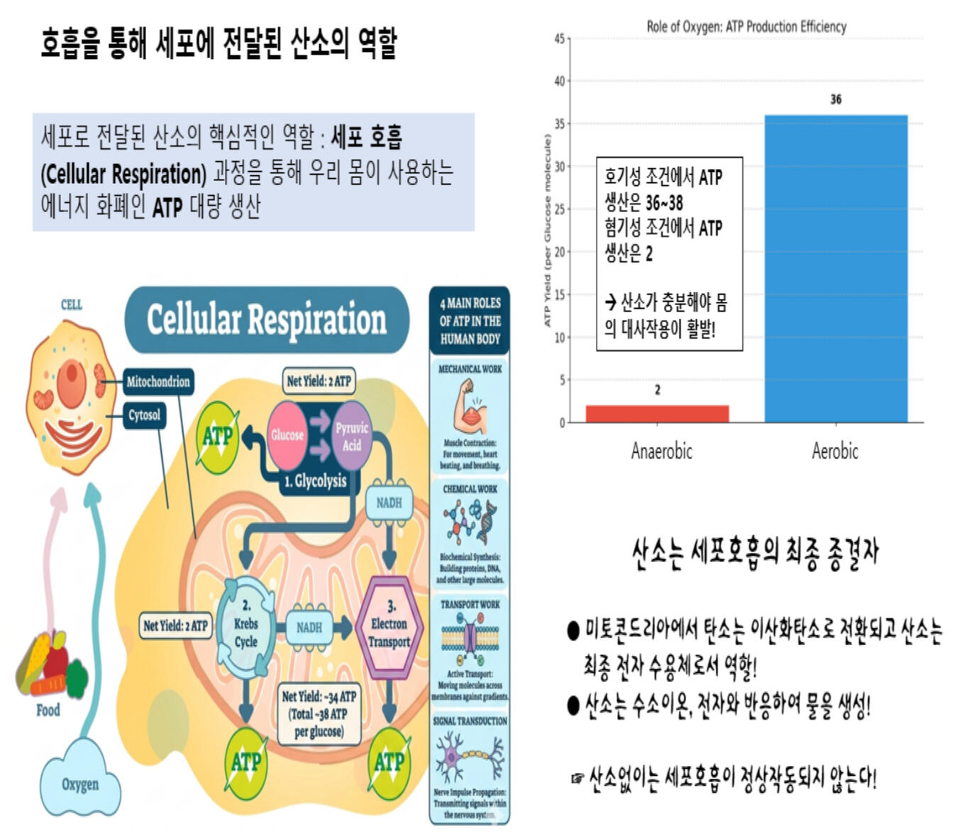 지구상 거의 모든 생명체는 산소를 호흡하고 세포에서 에너지를 생성하여 살아갑니다. 일부 미생물은 산소없이도 살아가지만 인간과 같은 고등동물은 산소 호흡에 절대적으로 의지하여 생존해 갑니다. 산소는 인체의 기초 단위인 세포의 에너지 생산 핵심 연료인 셈입니다.